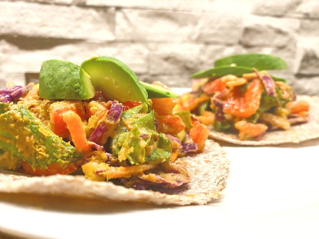 Heat tortillas in a pan until softened and warm. Add vegetable mixture to tortillas. Top with sliced avocado, additional salsa, and nutritional yeast (and extra lime if desired!).