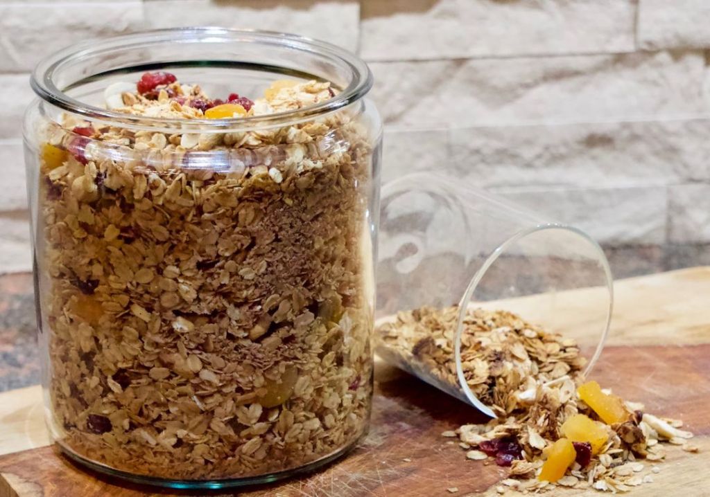 This is where it gets fun! I buy raw nuts in bulk at the local health food store, then dry roast them with a bit of salt in the oven. I try to find dried fruit with no added sugar or sweetened only with fruit juice. Fruit and nuts are my go to’s, but you could include things like dried coconut, chia seeds, flax, or chocolate chips. Just wait for the granola to cool before adding the mix-ins.