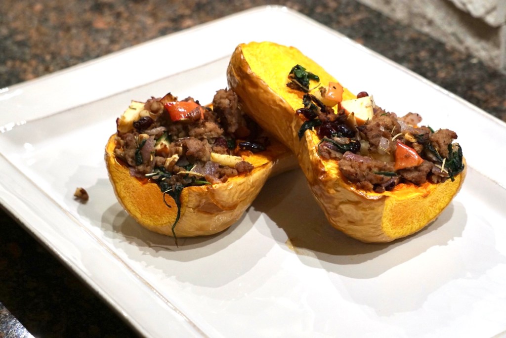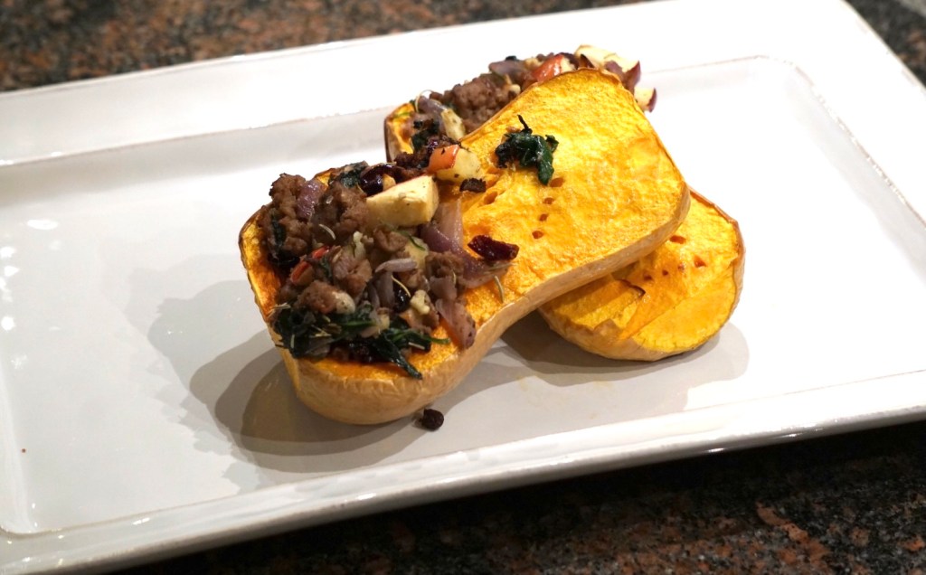 Butternut squash is one of my fall staple foods for many different types of recipes. Rich in vitamin C, vitamin B6 and Potassium it’s an excellent food to have on your weekly rotations. With it’s nutty profile it pairs well with both sweet and savory recipes. Mix into your favorite stews, soups, stir fry’s, oats, muffins and one of my most recent favorites, stuffed squash.