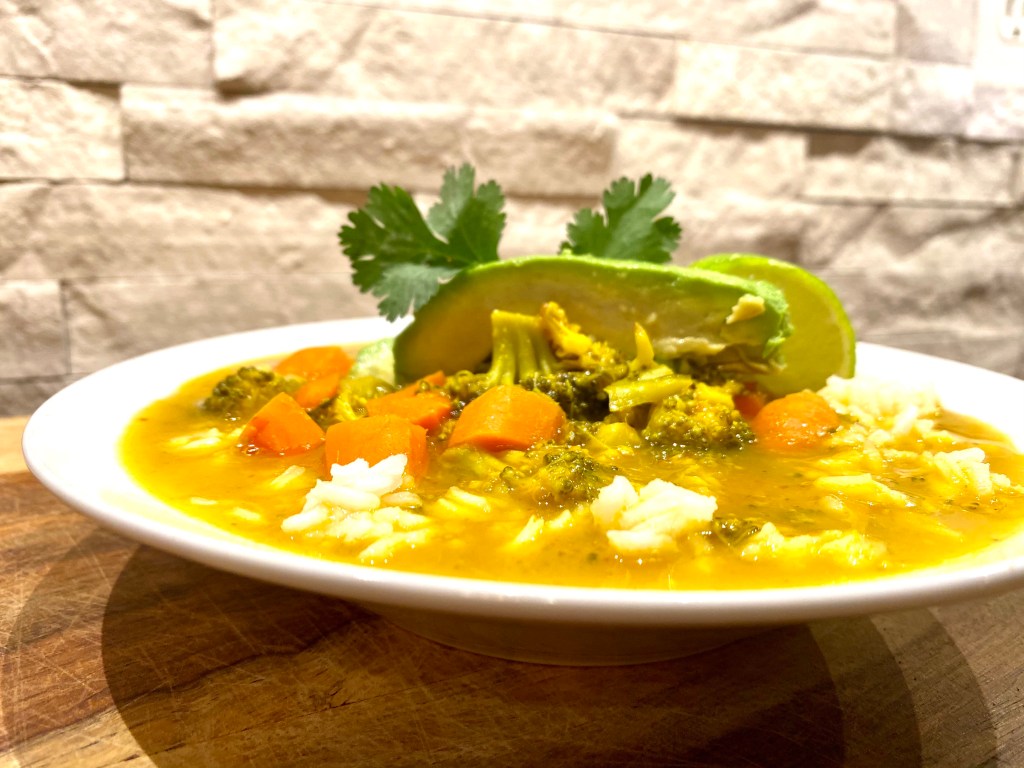 Soups are fantastic because you can really just throw whatever you have into a pot, add some broth and seasonings and call it a day! I experimented with this recipe as a curry but decided I liked it as a soup better, but you could totally leave the broth out to make it a little heartier. Typically I’ll serve the soup over a little jasmine rice but you could serve it just as itself too…just don’t mix the rice in the soup, it needs to be on the bottom of your bowl first (trust me:)