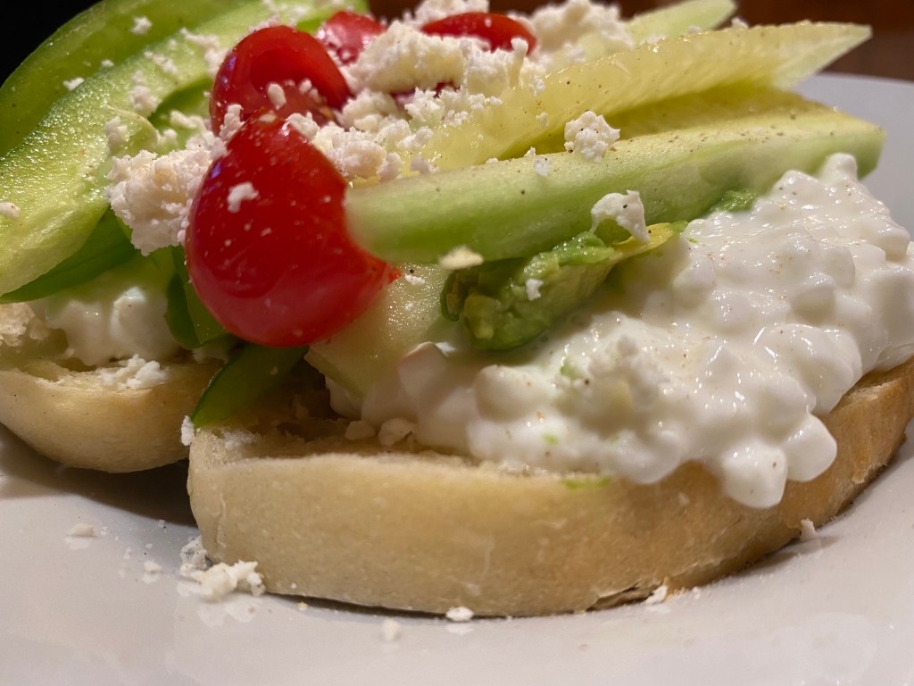 Toast 2 slices sourdough bread. Spread 1/4 avocado on each piece. Top with 1/2 cup cottage cheese on each piece. Layer sliced veggies evenly on top followed by a sprinkle of cojita cheese sea salt, pepper, and optional balsamic vinegar. This is an excellent post workout snack or even full on meal!